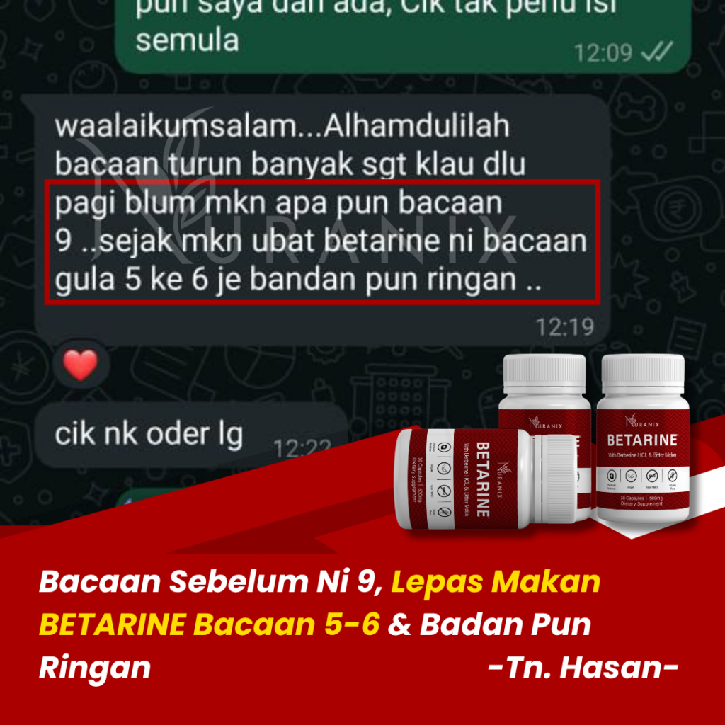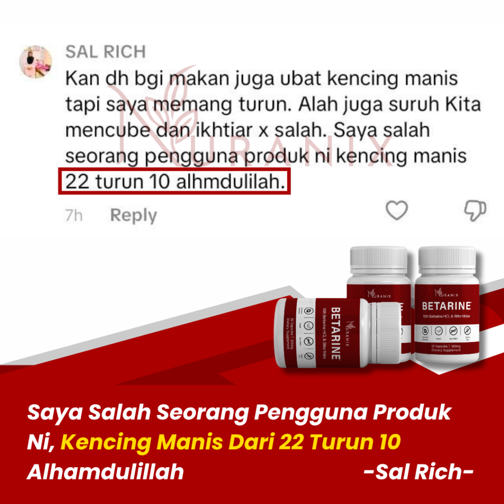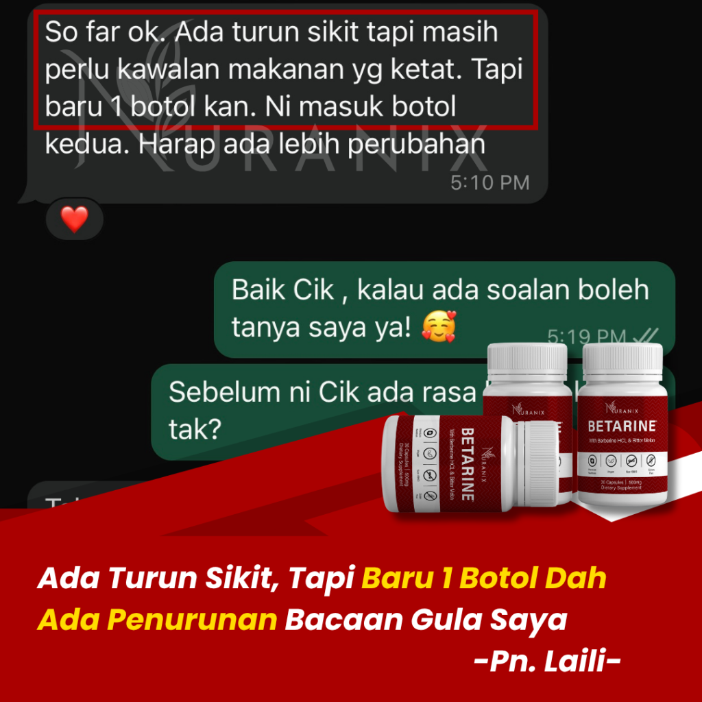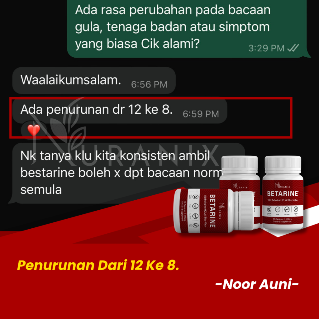 – Asiah, 54Sebelum ni check gula waktu pagi okay je, lepas je makan memang terus tinggi bacaan. Tapi sejak amal Betarine ni dia naik jugak cuma tak naik mengarut sangat macam sebelum ni la. Kalau sebelum ni, lepas sarapan tu rasa takut nak tengok bacaan gula. Sekarang Alhamdulillah la stabil je sepanjang hari!
