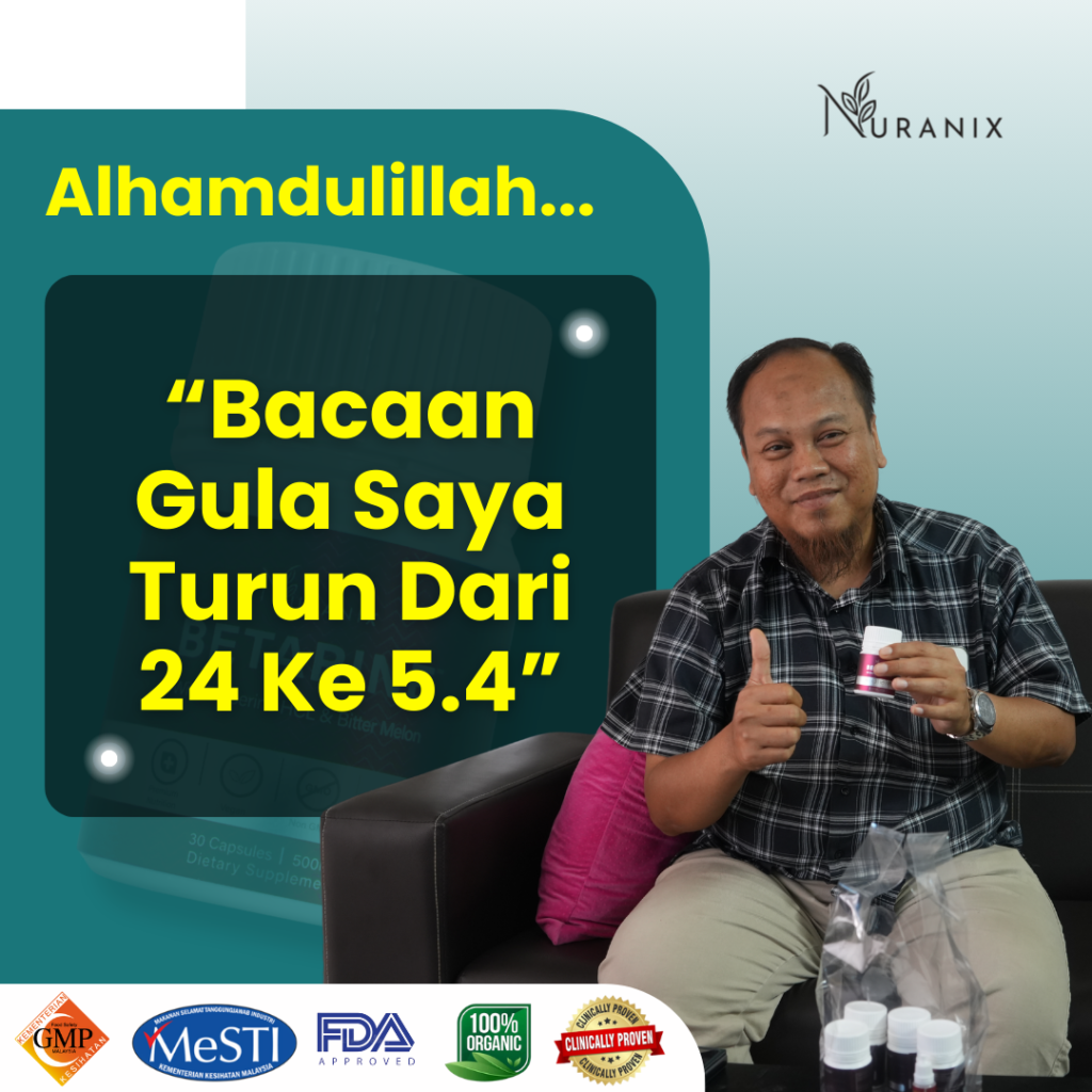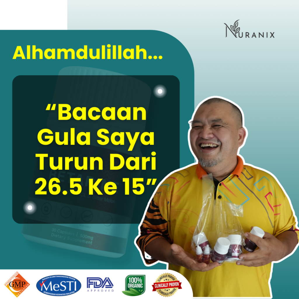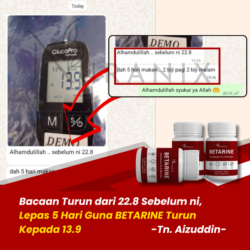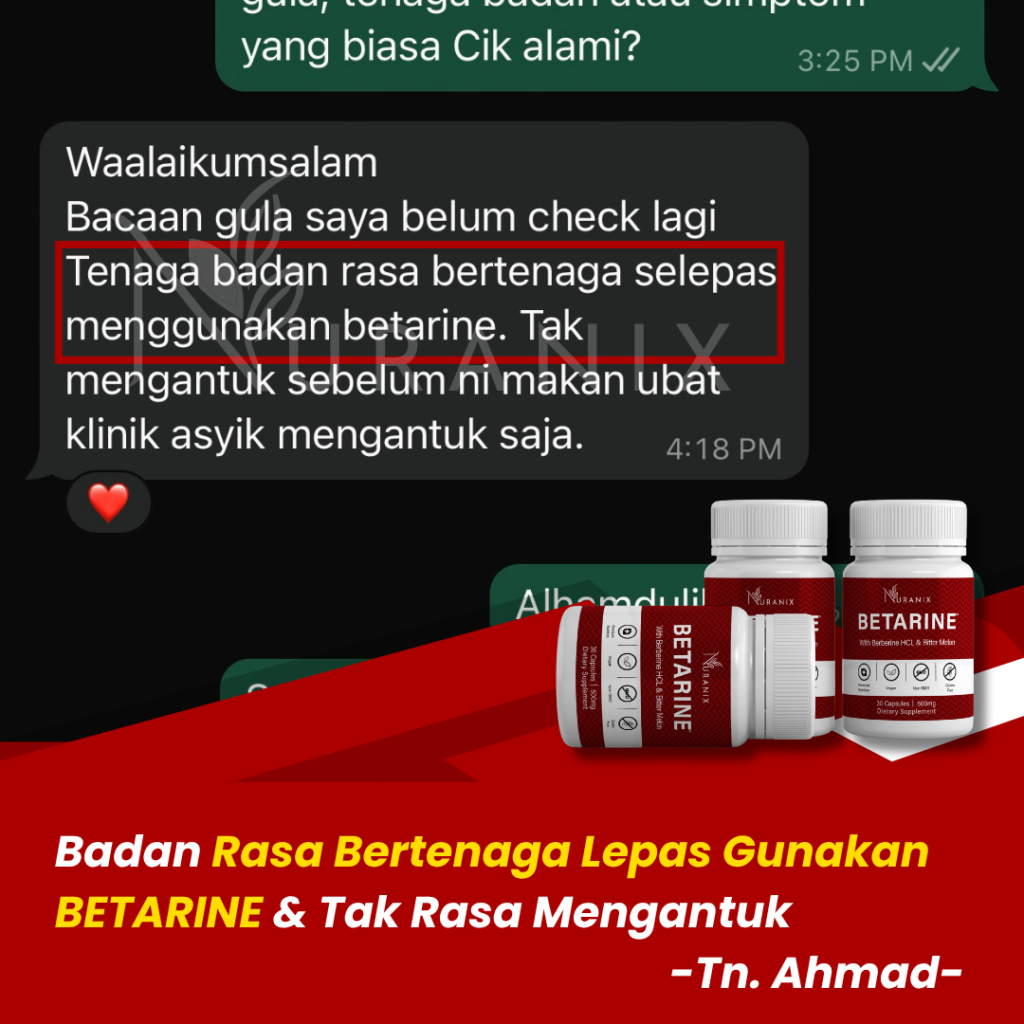 – Asiah, 54Sebelum ni check gula waktu pagi okay je, lepas je makan memang terus tinggi bacaan. Tapi sejak amal Betarine ni dia naik jugak cuma tak naik mengarut sangat macam sebelum ni la. Kalau sebelum ni, lepas sarapan tu rasa takut nak tengok bacaan gula. Sekarang Alhamdulillah la stabil je sepanjang hari!