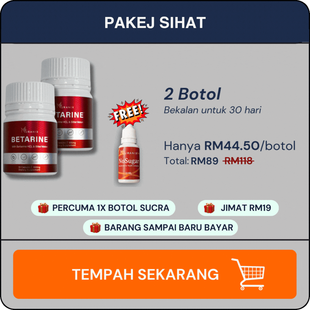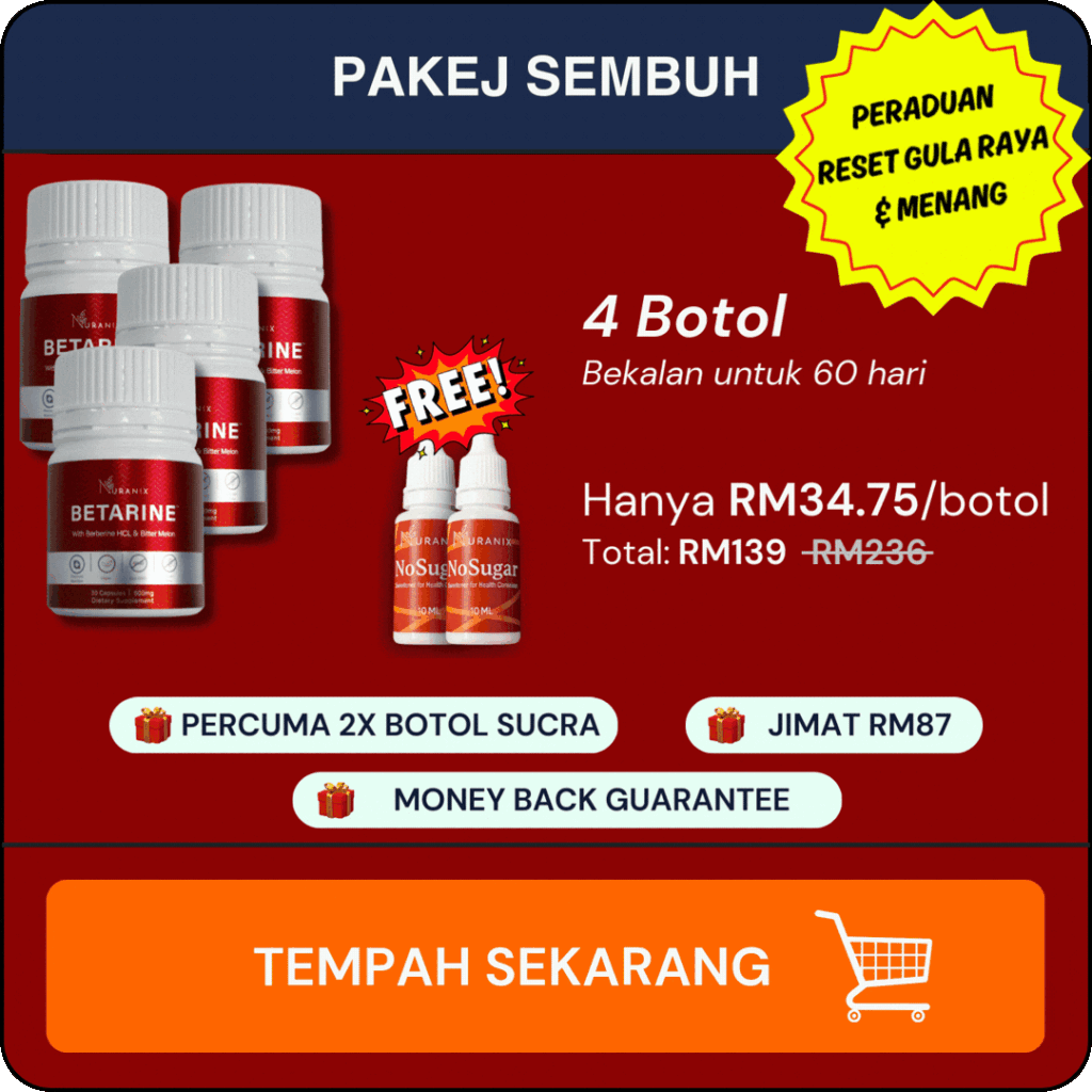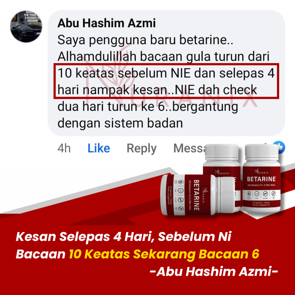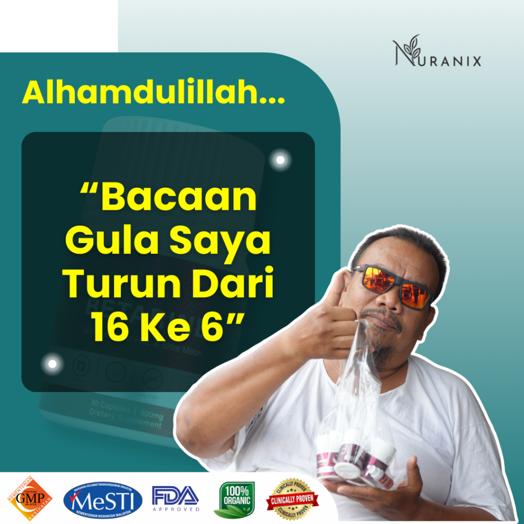 – Asiah, 54Sebelum ni check gula waktu pagi okay je, lepas je makan memang terus tinggi bacaan. Tapi sejak amal Betarine ni dia naik jugak cuma tak naik mengarut sangat macam sebelum ni la. Kalau sebelum ni, lepas sarapan tu rasa takut nak tengok bacaan gula. Sekarang Alhamdulillah la stabil je sepanjang hari!
